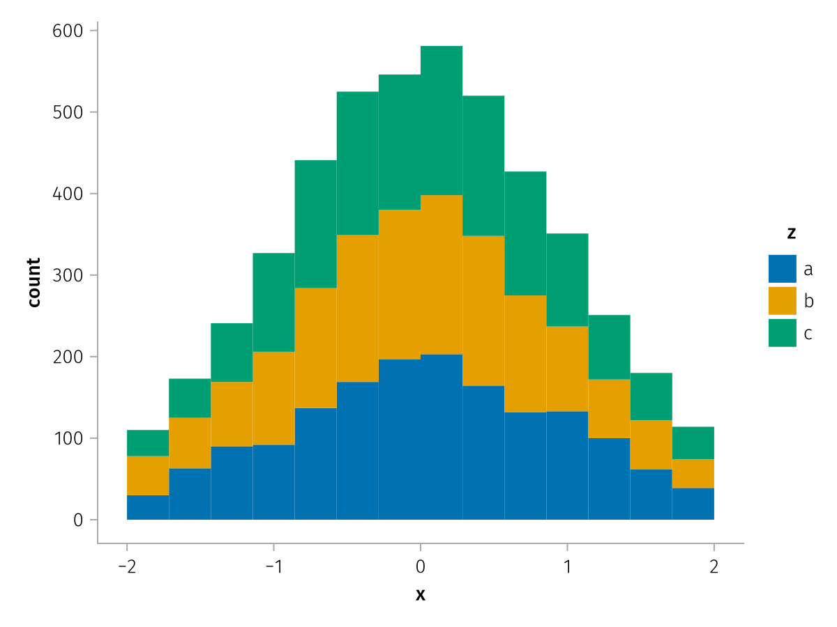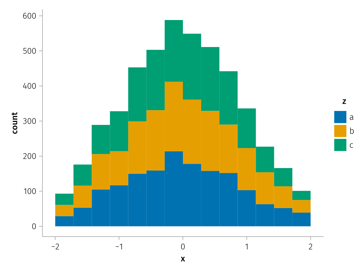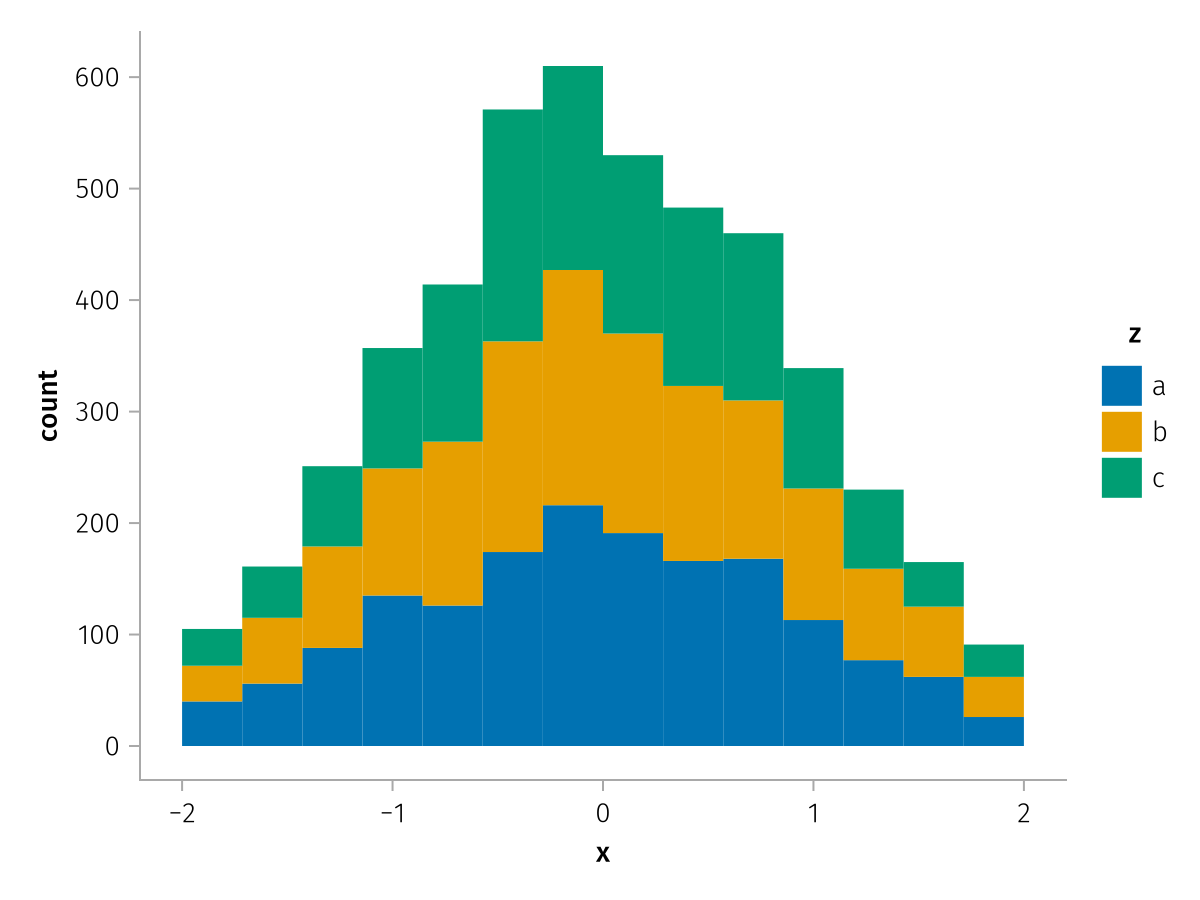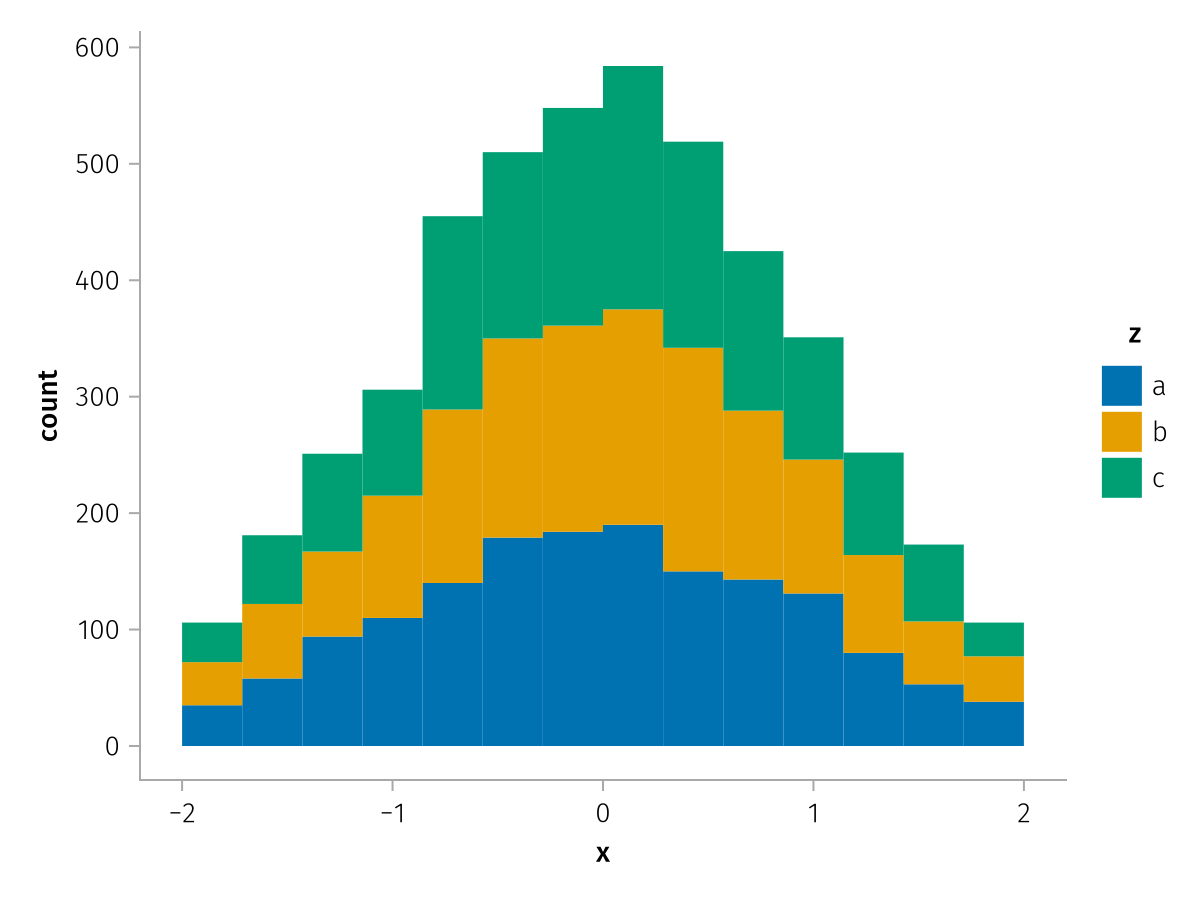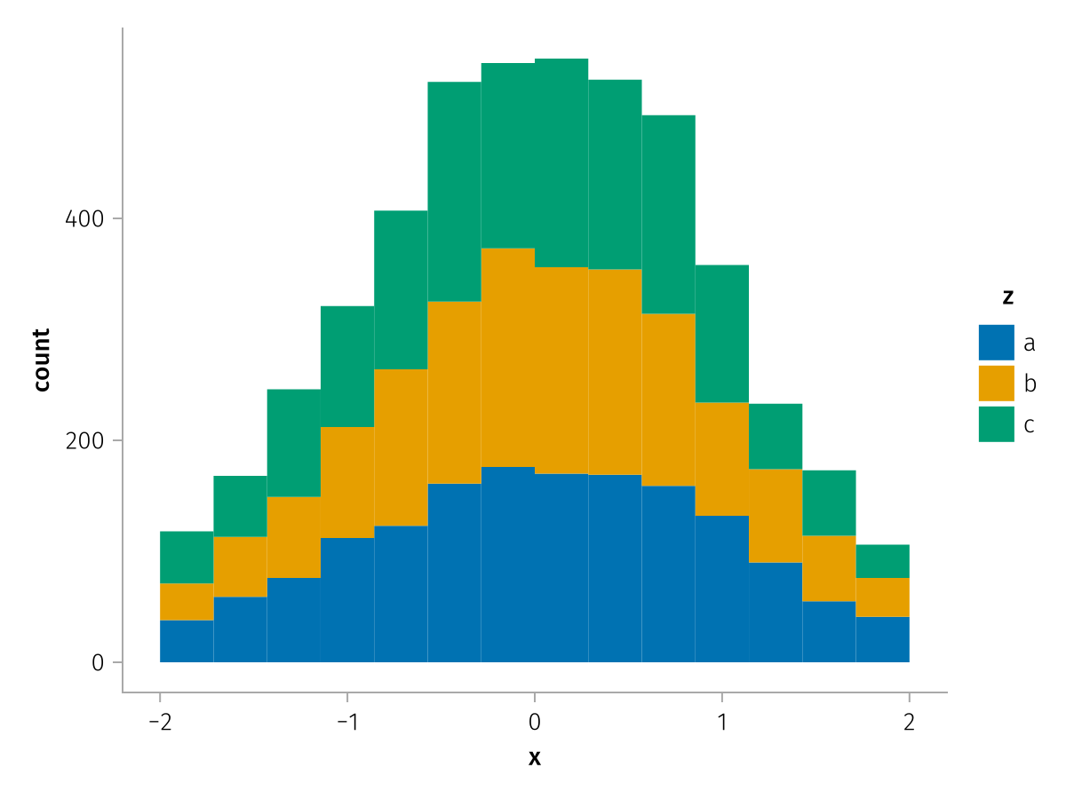 specs = data(df) * mapping(:x, stack=:z, color=:z) * histogram(bins=range(-2, 2, length=15))