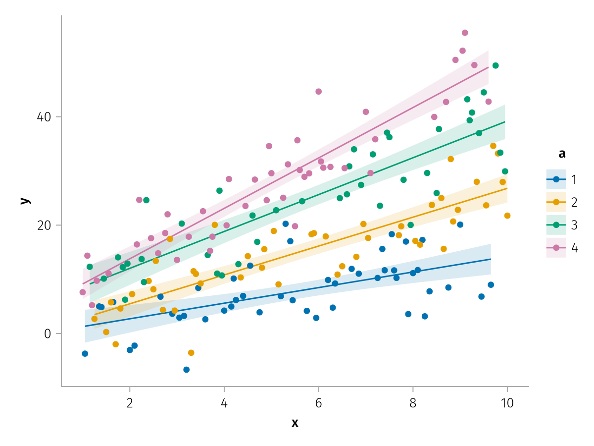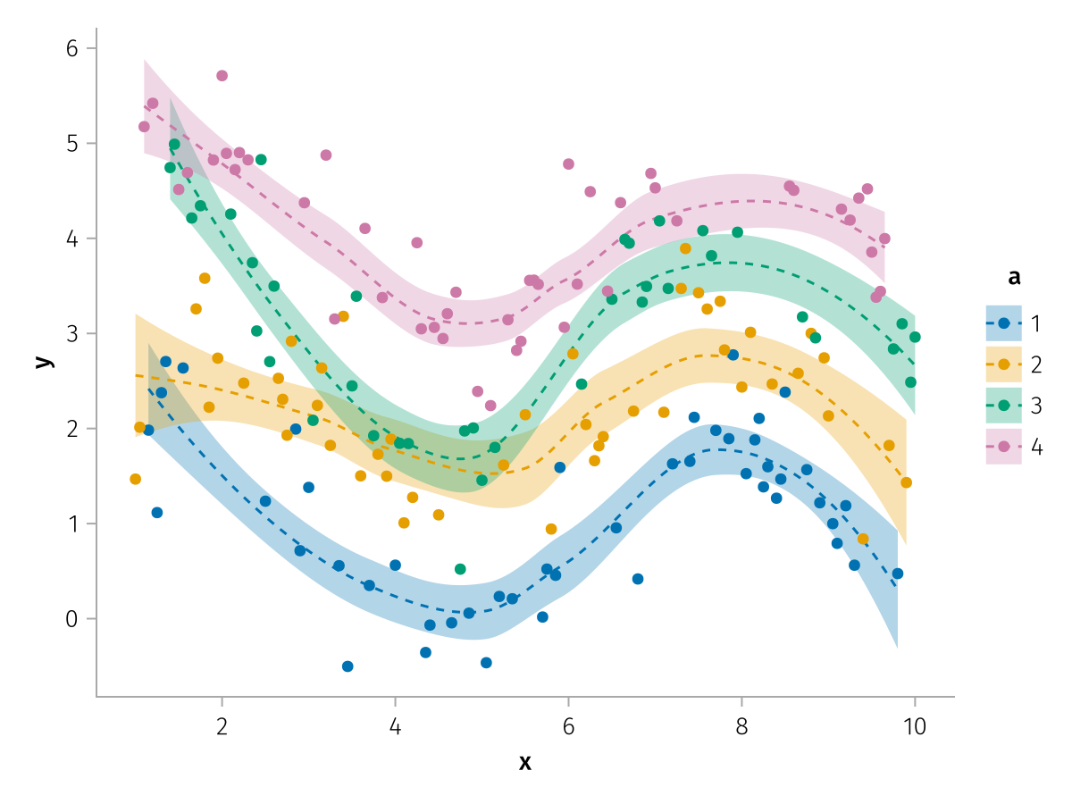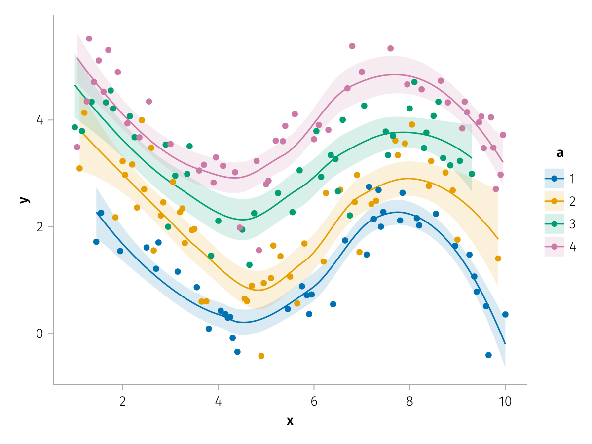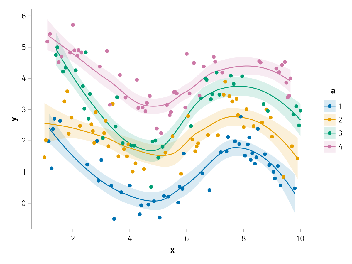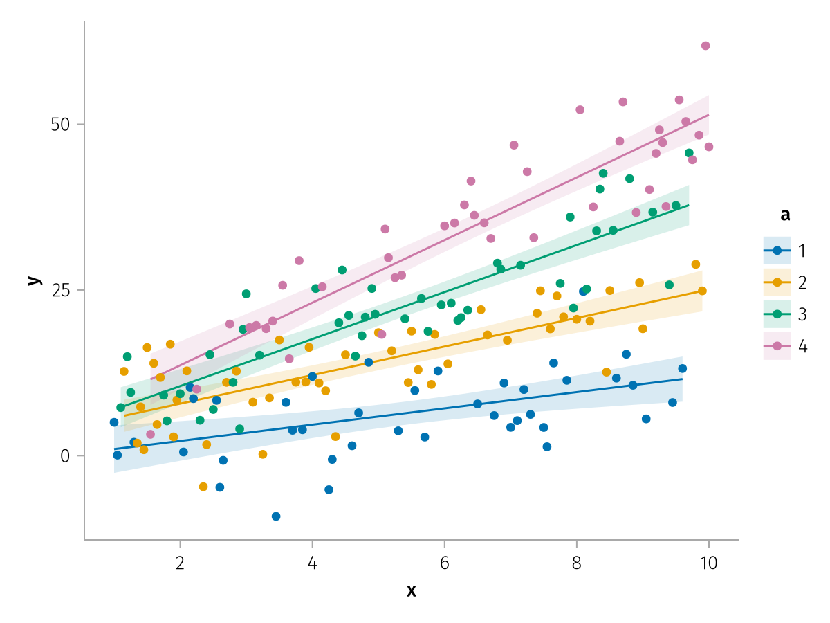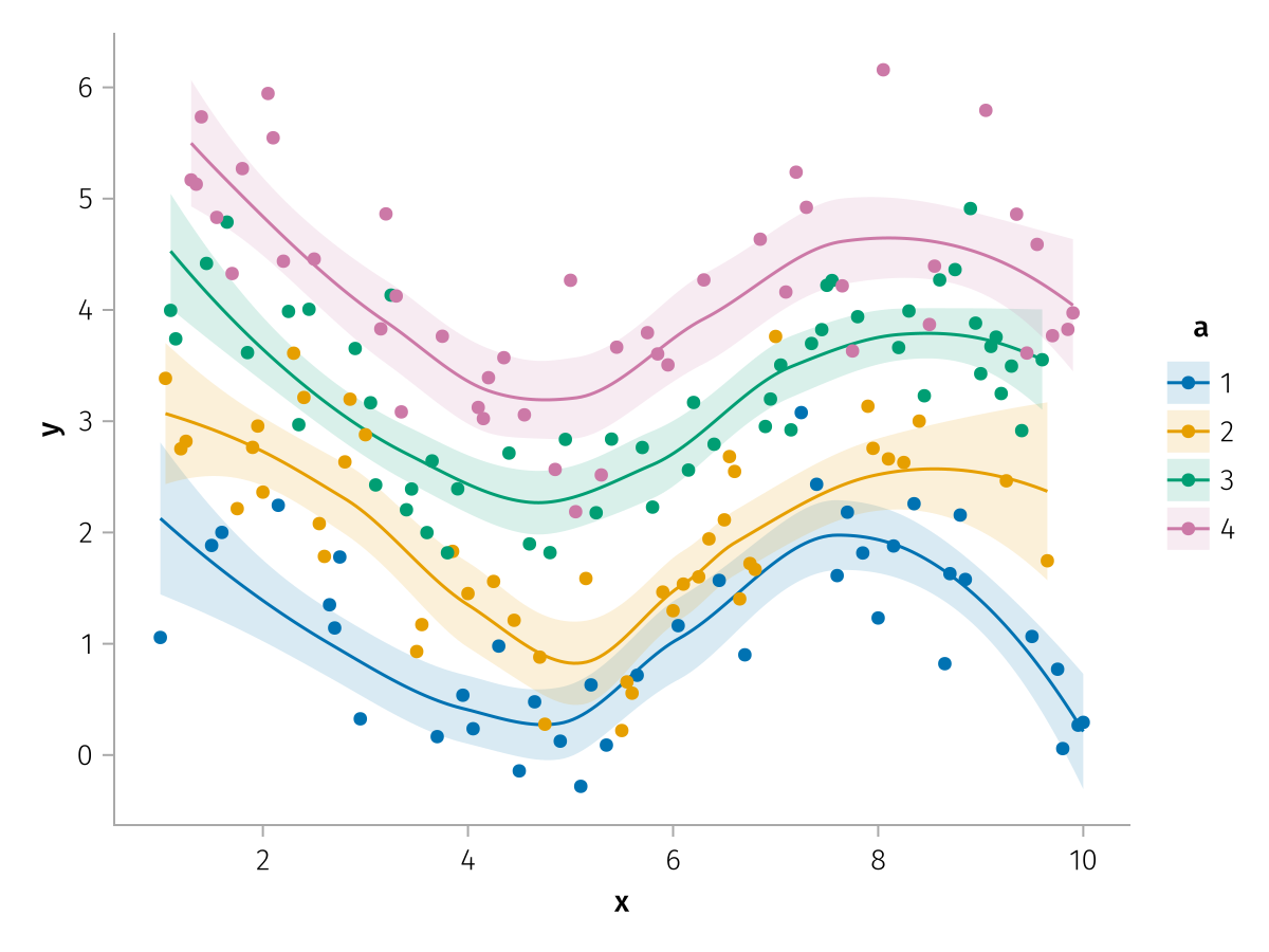 specs = data(df) * mapping(:x, :y, color=:a => nonnumeric) * (smooth() + visual(Scatter))
