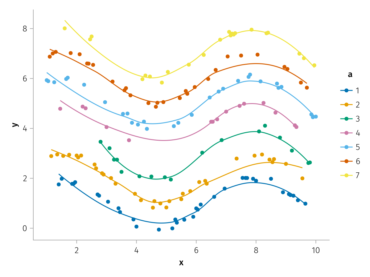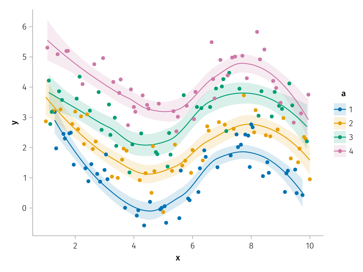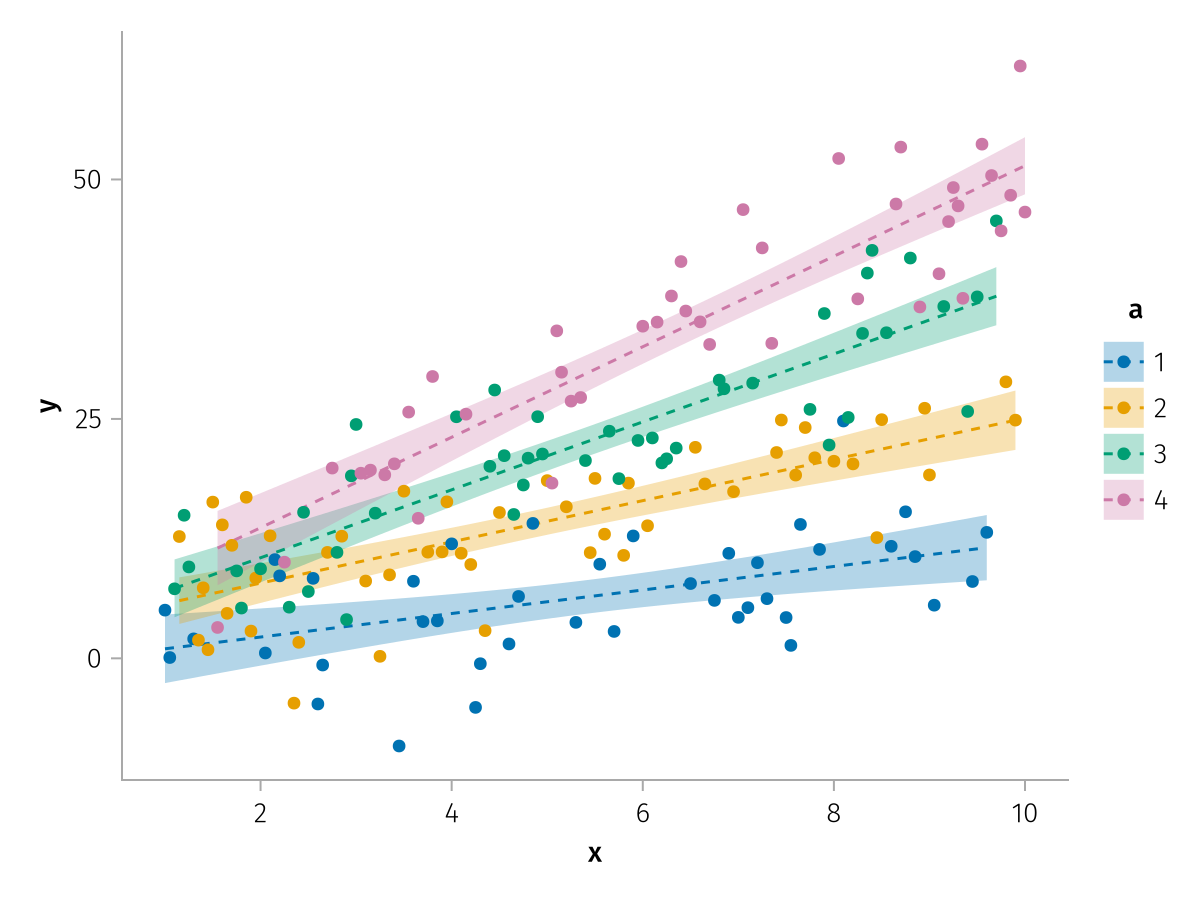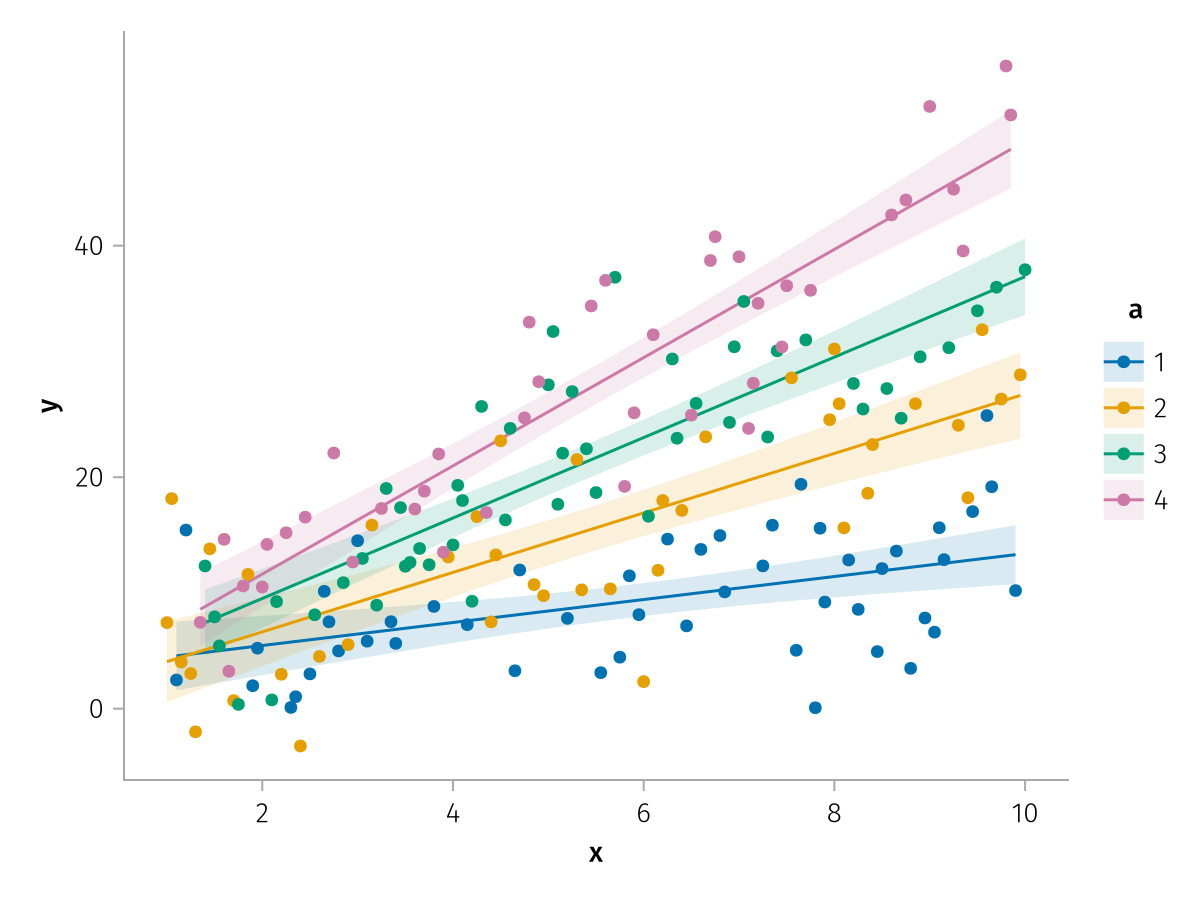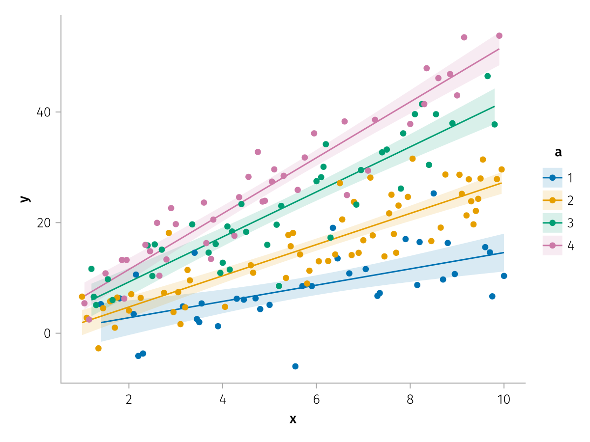 specs = data(df) * mapping(:x, :y, color=:a => nonnumeric) * (smooth() + visual(Scatter))