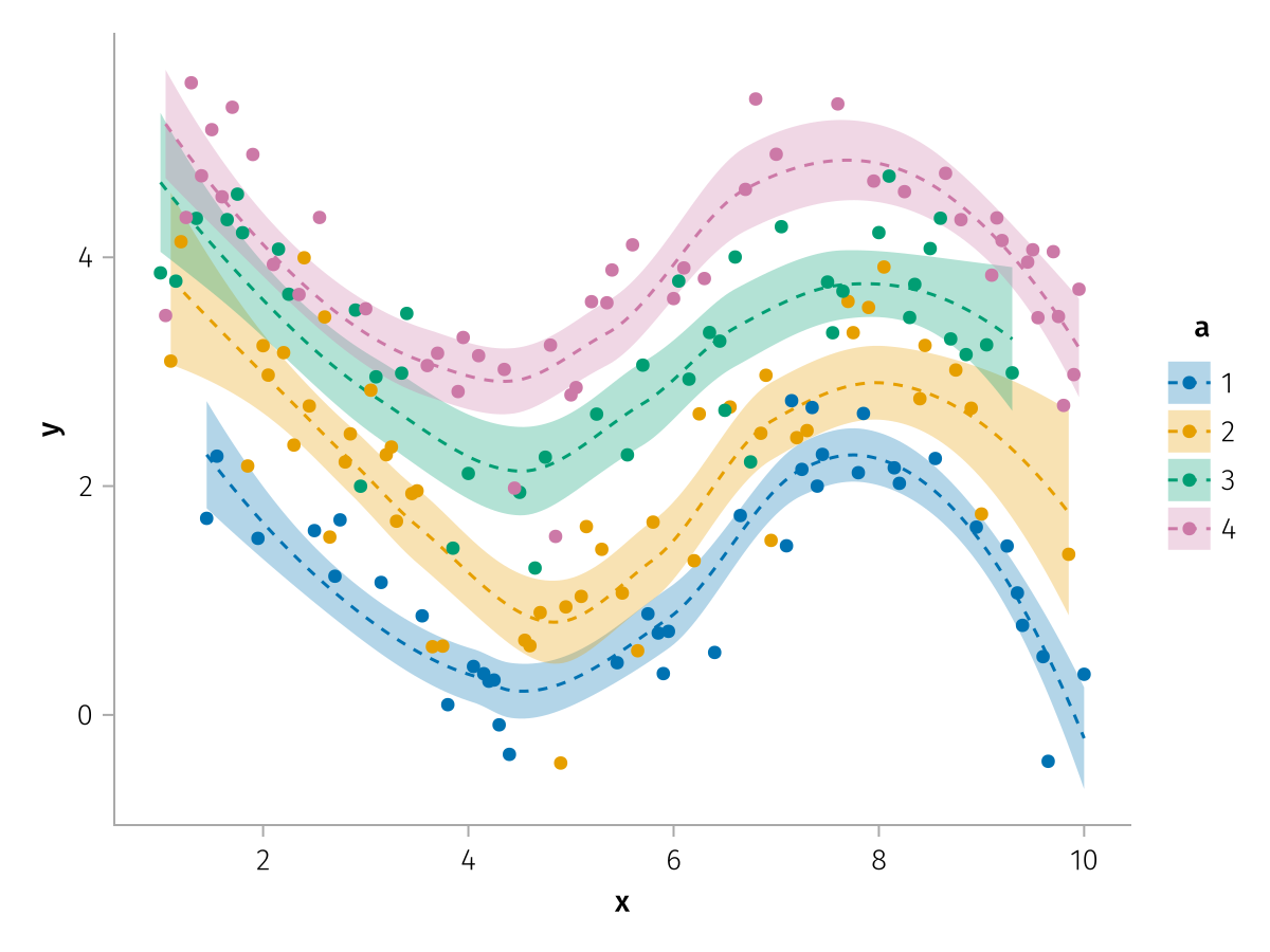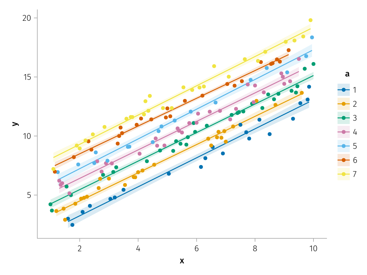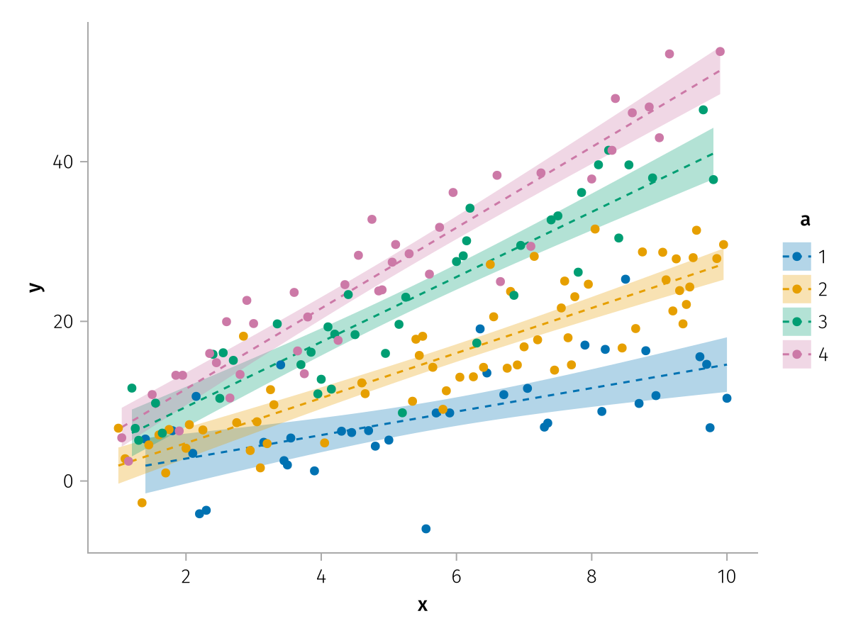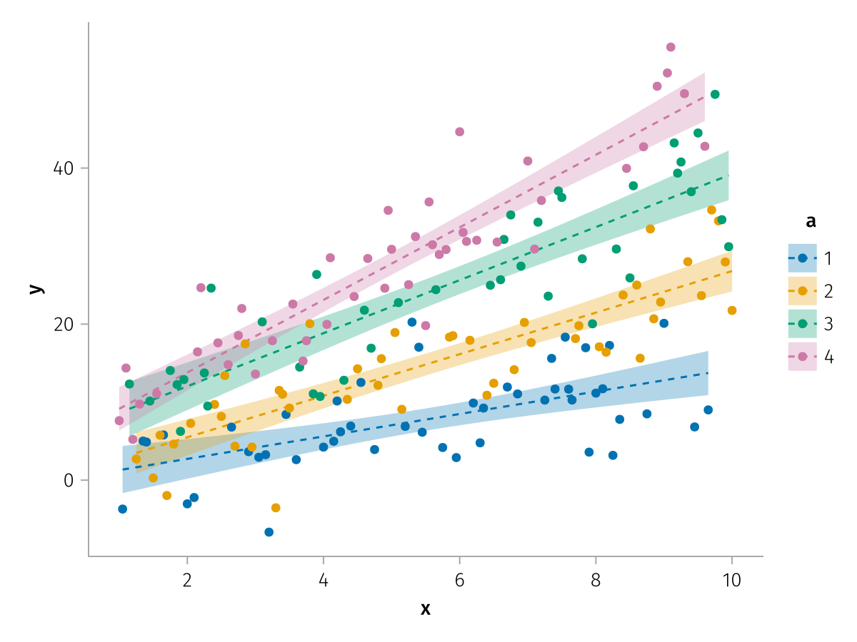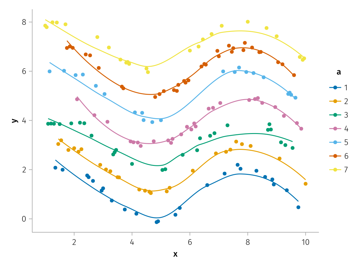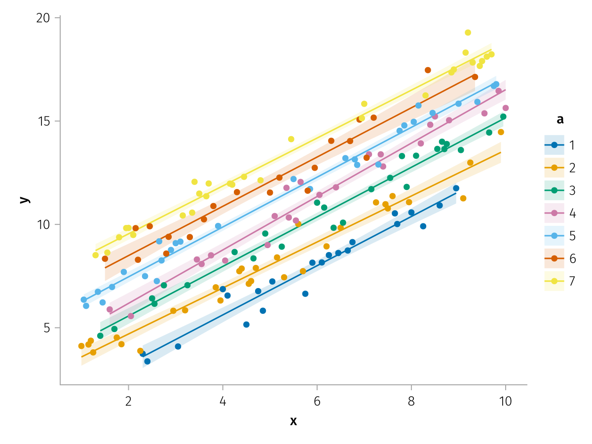 specs = data(df) * mapping(:x, :y, color=:a => nonnumeric) * (smooth() + visual(Scatter))
