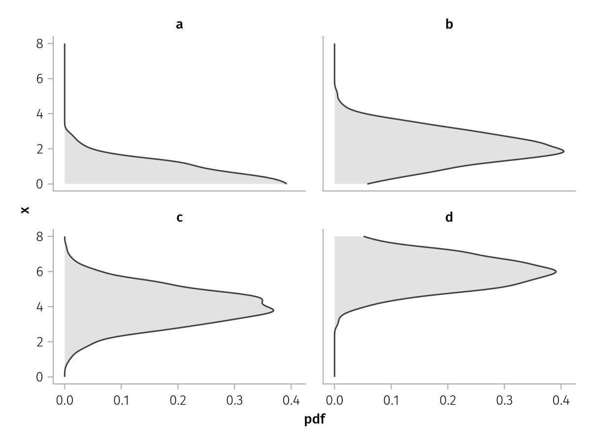 Here, datalimits specifies the range for which the density should be calculated (it defaults to the extrema of the whole data). The keyword argument datalimits can be a tuple of two values, e.g. datalimits=(0, 10), or a function to be applied group by group, e.g. datalimits=extrema. The keyword arguments kernel and bandwidth are forwarded to KernelDensity.kde. npoints is the number of points used by Makie to draw the line