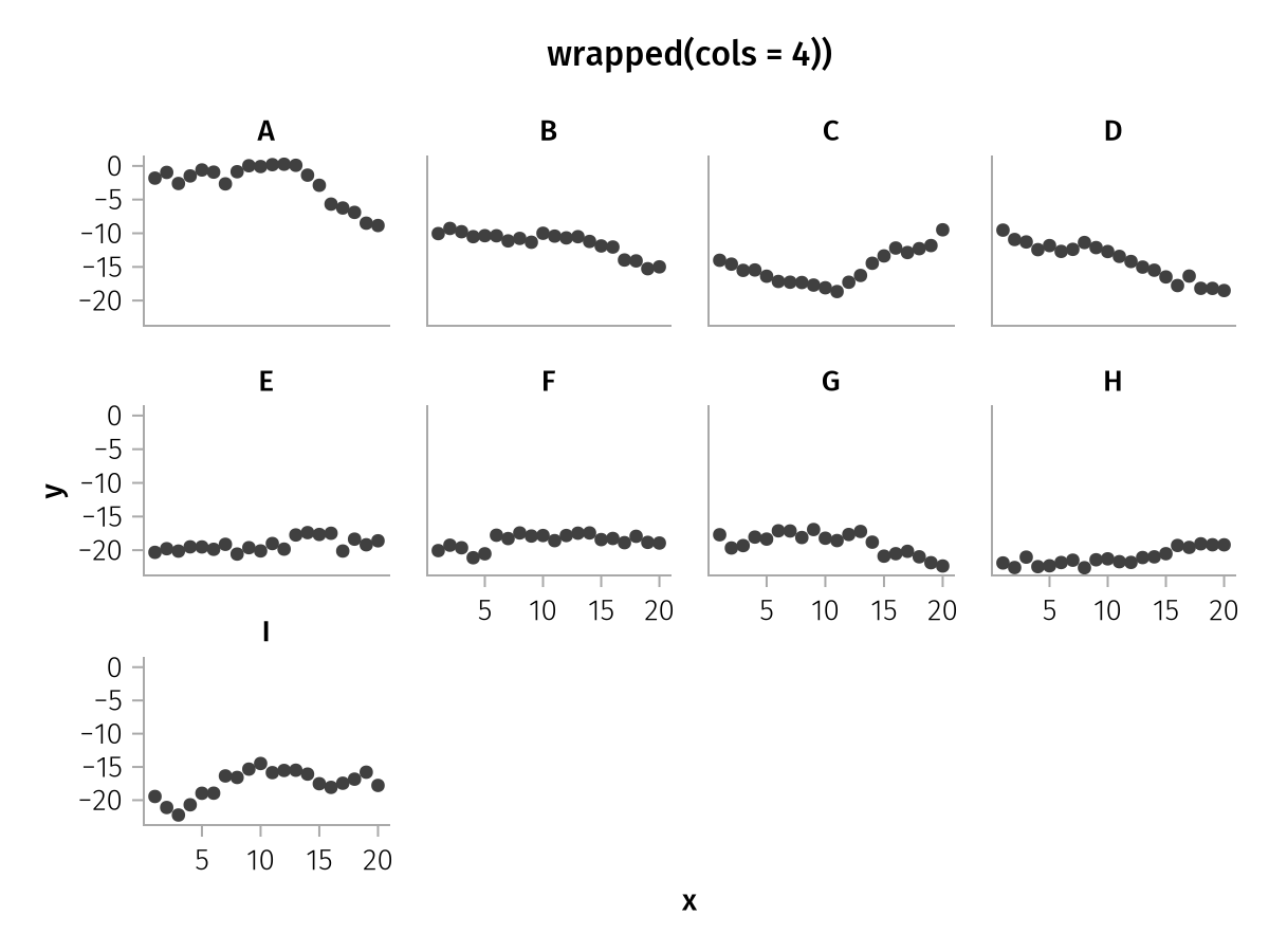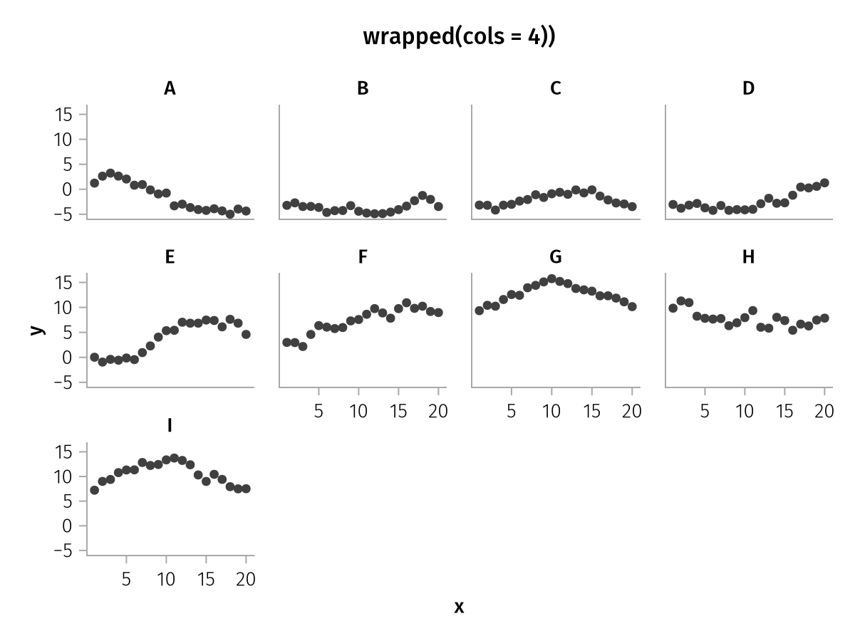 Normally, with the Layout aesthetic, rows wrap automatically such that an approximately square distribution of facets is attained. The wrapped function is a convenient helper to control the shape of the layout. You can control the maximum rows or columns, and the direction in which the layout is filled, which is row-by-row by default.