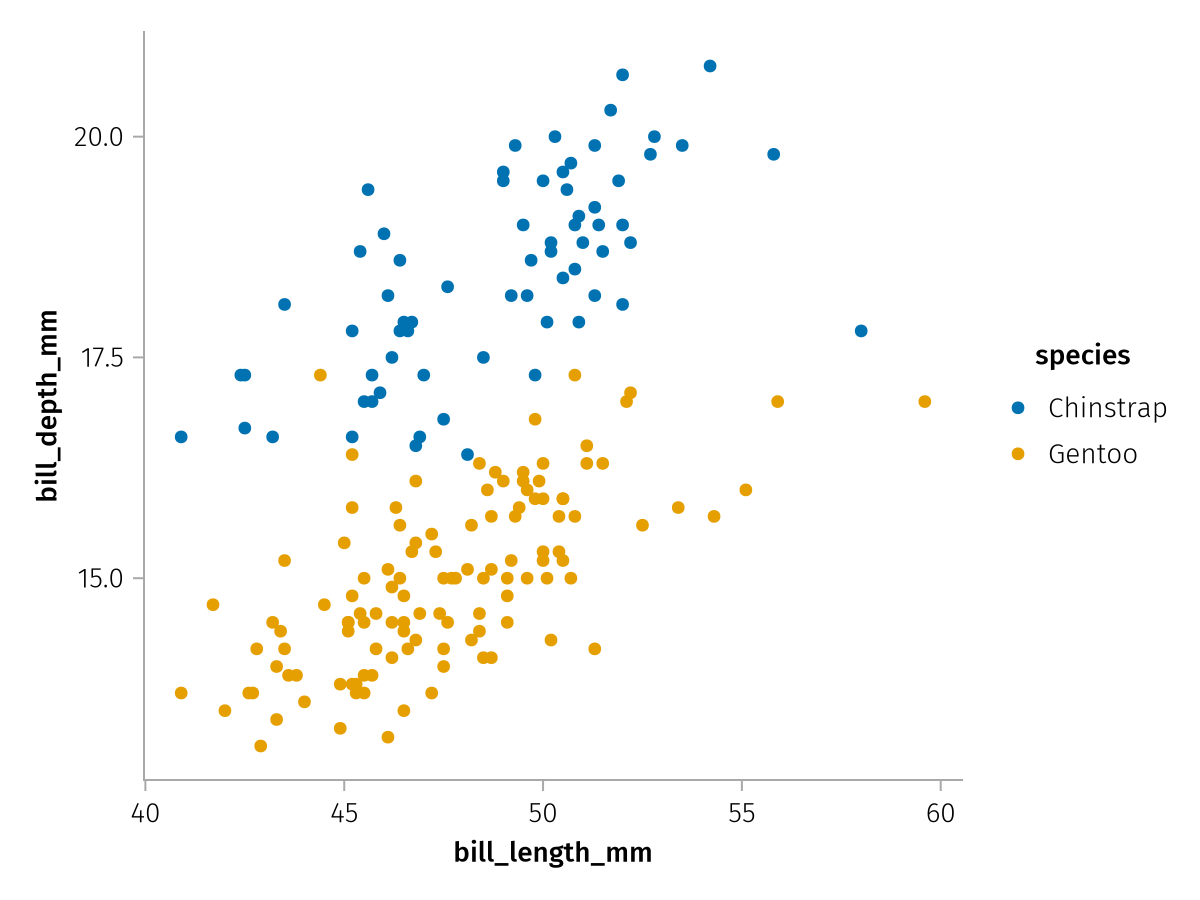 no_adelie_scatter_layer = data(penguins_no_adelie) * shared_mapping * visual(Scatter)