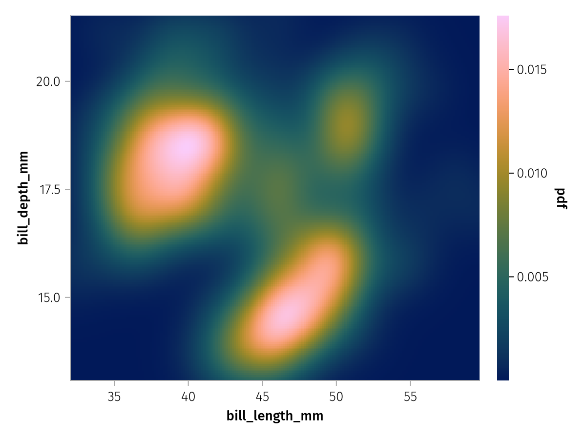 You can see that the density function resulted in a heatmap in which continuous color visualizes the probability density function or pdf of our data. For transformations that only create a single layer, like the heatmap here, we can sometimes conveniently switch out the plotting function that is used with transformed data, by multiplying with a visual that is compatible with the same arguments.