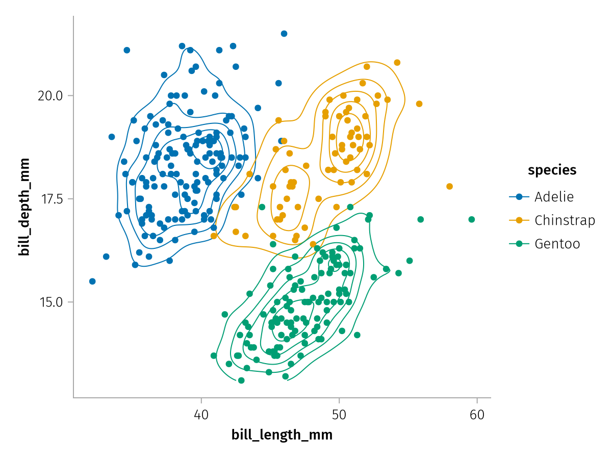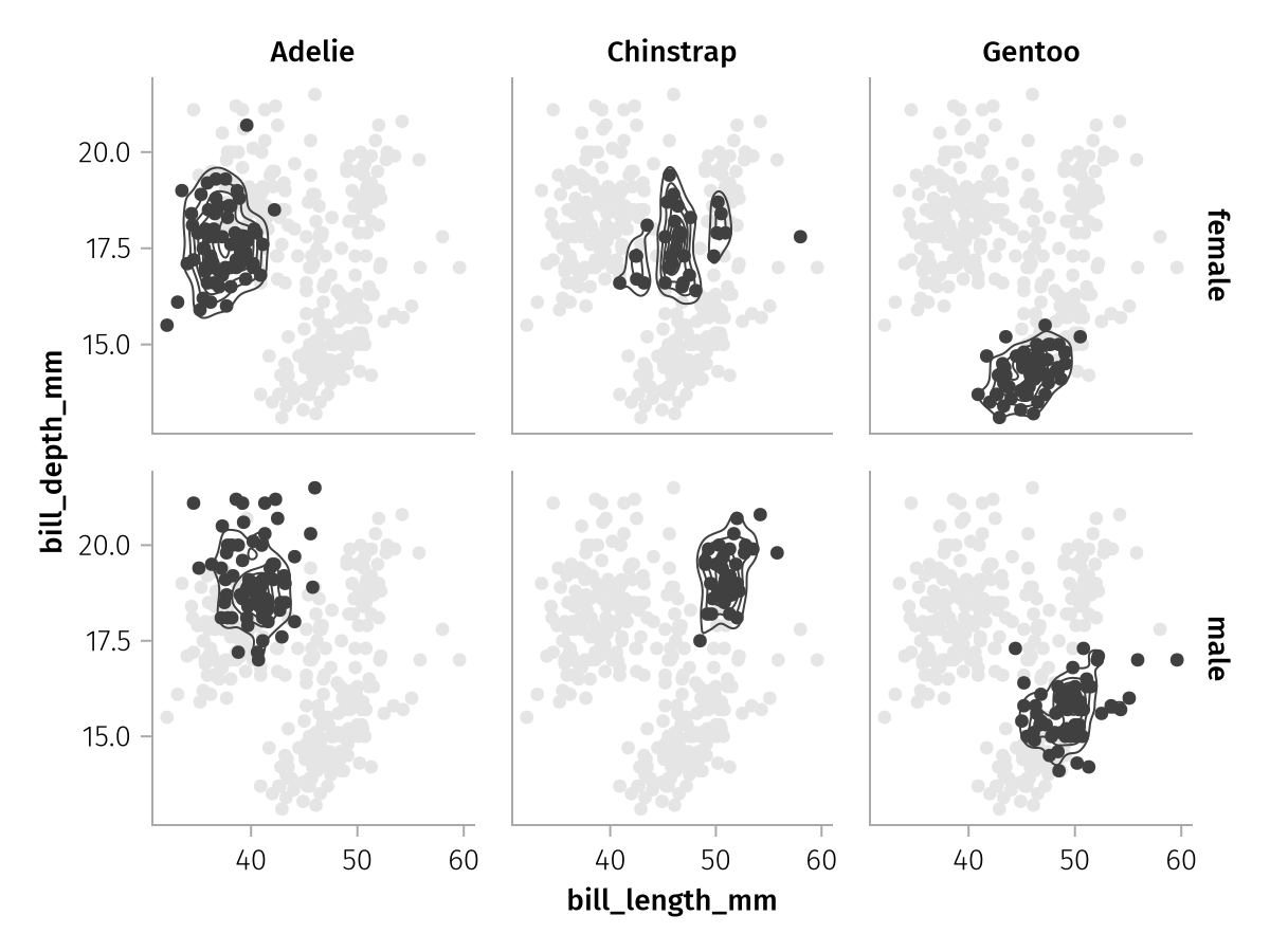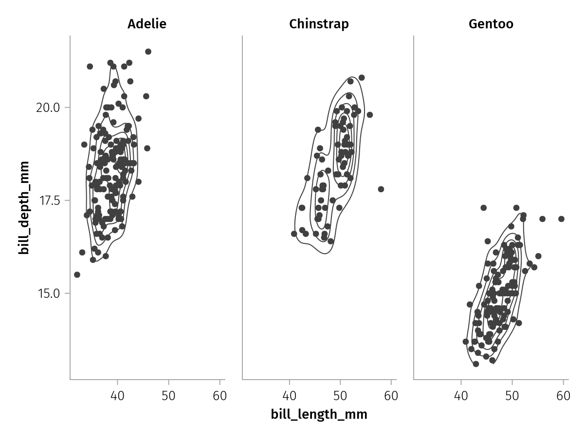 What if we want to show one contour plot per group in a single facet, but we don't want to split by color or any other aesthetic? In that case, we can use the group mapping, which simply splits a layer into multiple separate plots without adding any other visual properties.