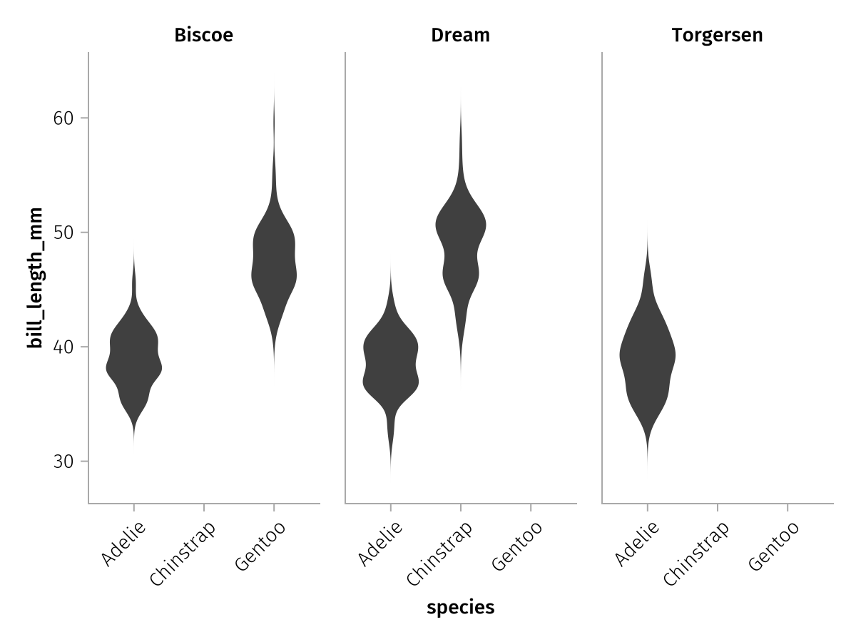 violins = data(penguins) * mapping(:species, :bill_length_mm, col = :island) * visual(Violin)