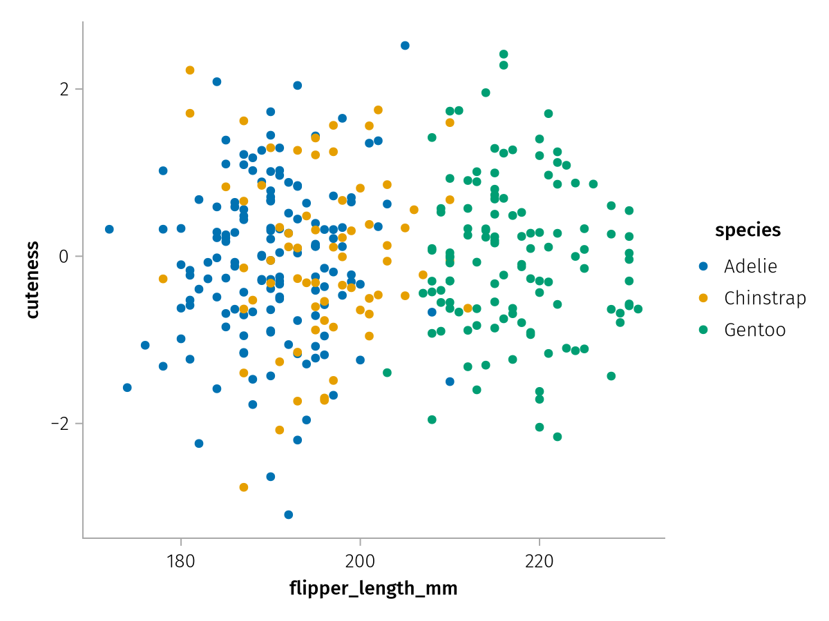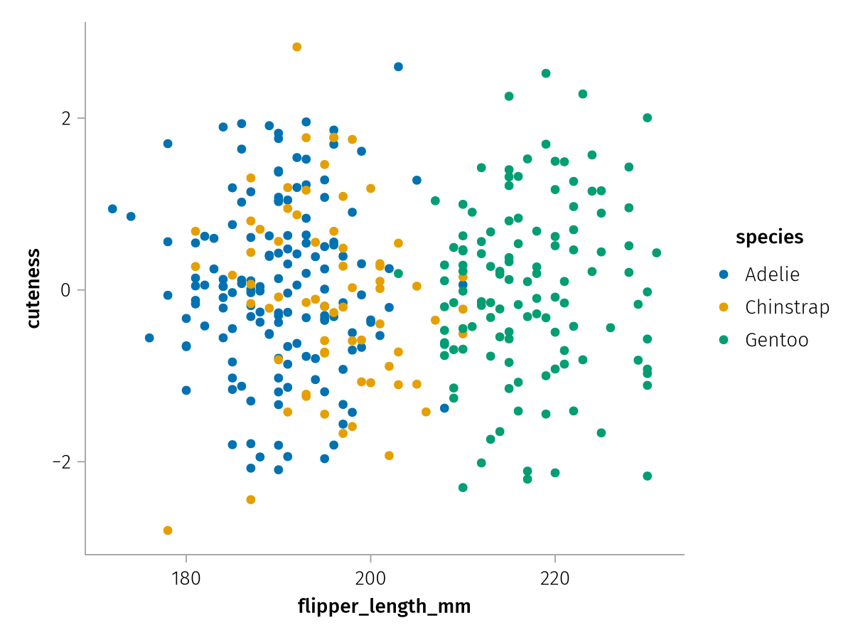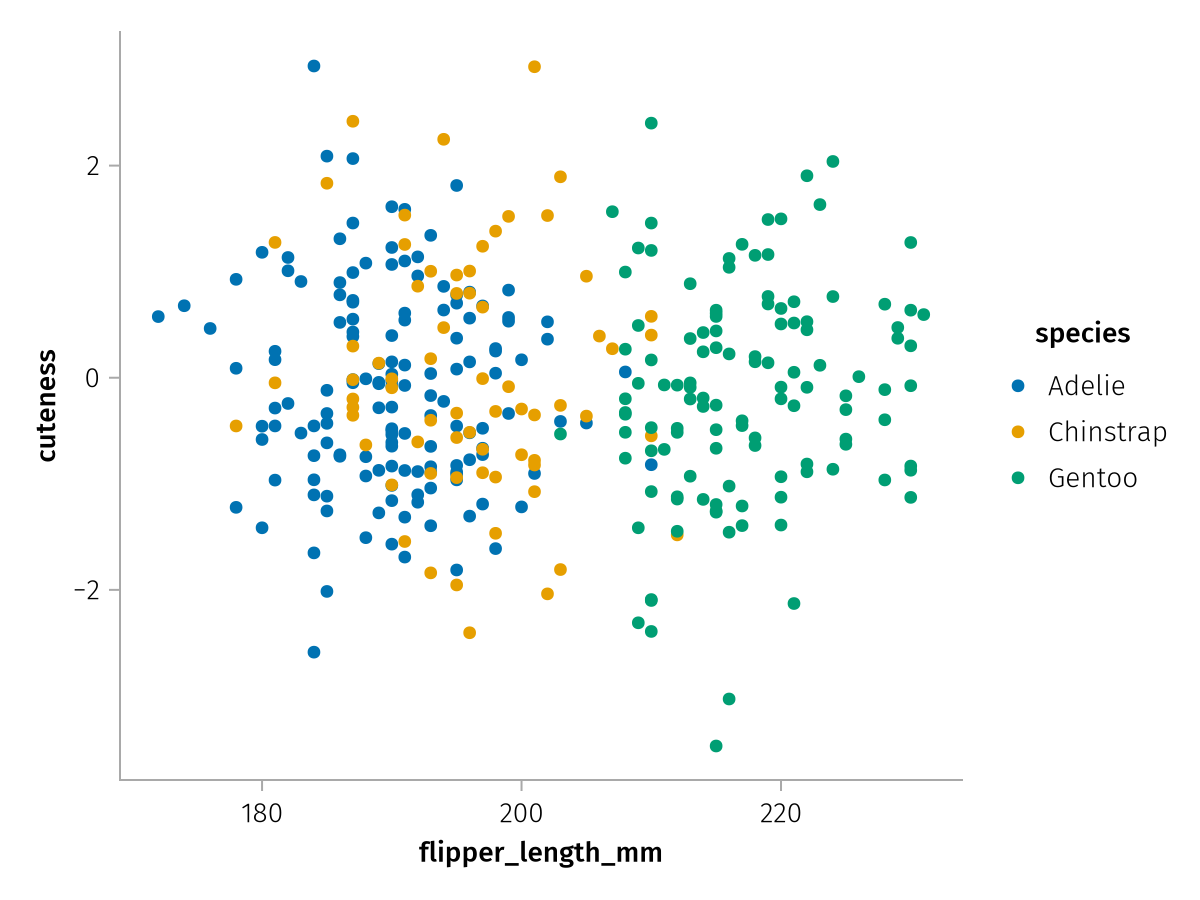 Let's pretend we have computed a "cuteness score" for our penguins using some classifier, which we now have in a vector. We can create a plot where we mix that data with the penguins dataframe without having to construct a new table:
