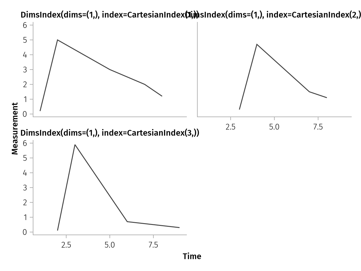 size(timings)(3, 4, 3)As you can see, we have an array of arrays with shape (3, 4, 3), so we can pass that directly via pregrouped and use dims to assign the three dimensions to different aesthetics: