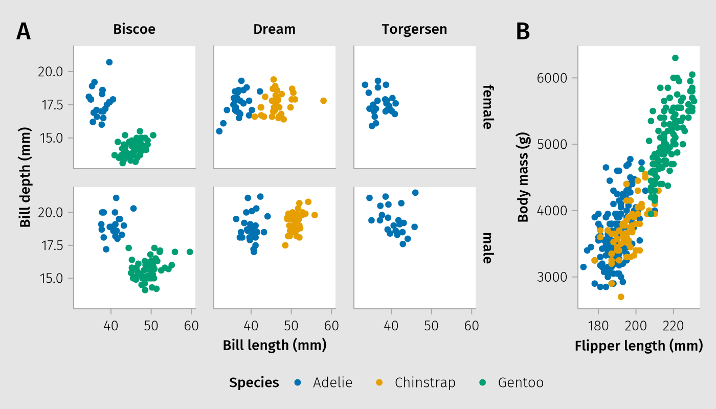 Let's first bring our trusty old penguin dataset back in and draw a basic facet plot. We store the output of draw in a variable figuregrid, too: