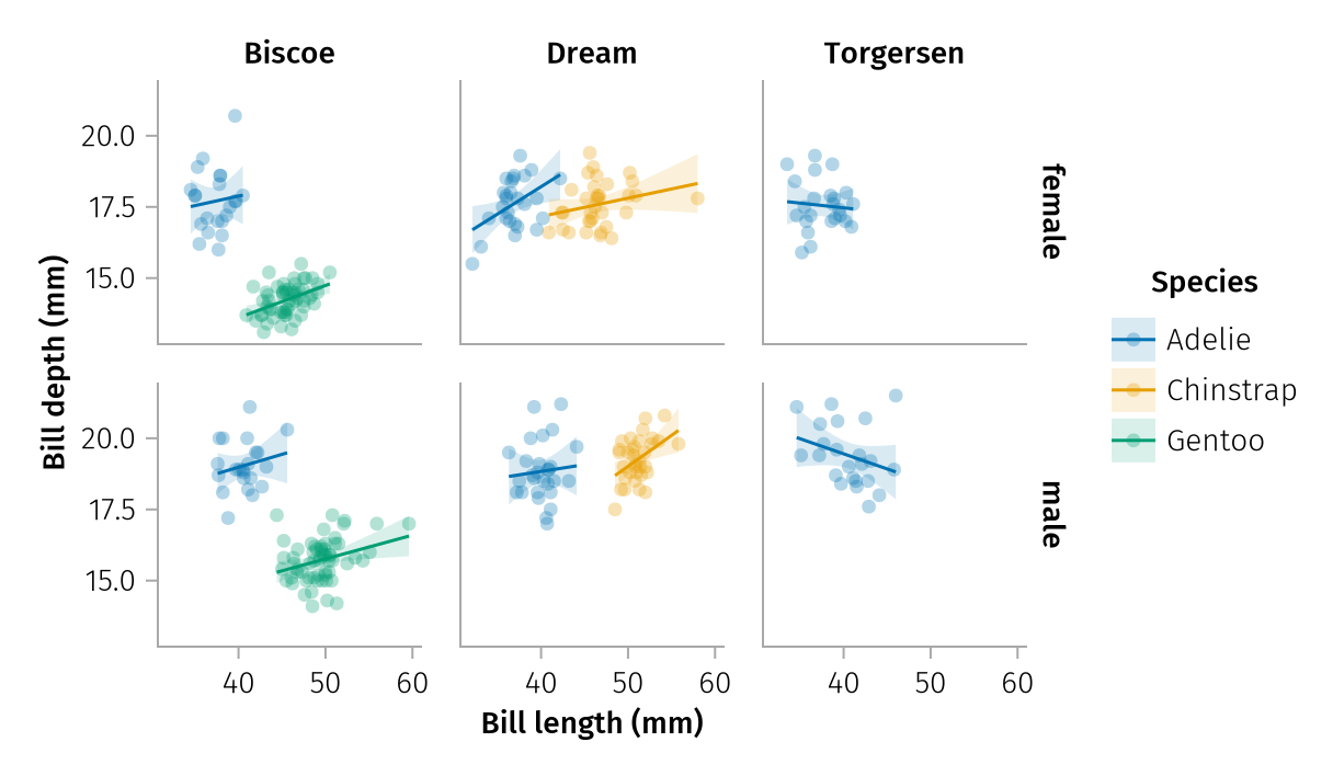 In AlgebraOfGraphics, a few simple building blocks can be combined using + and * to quickly create complex visualizations, like this: