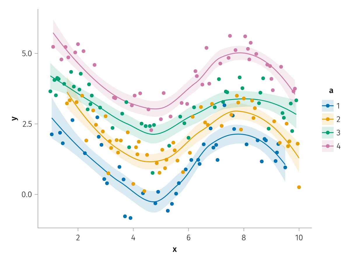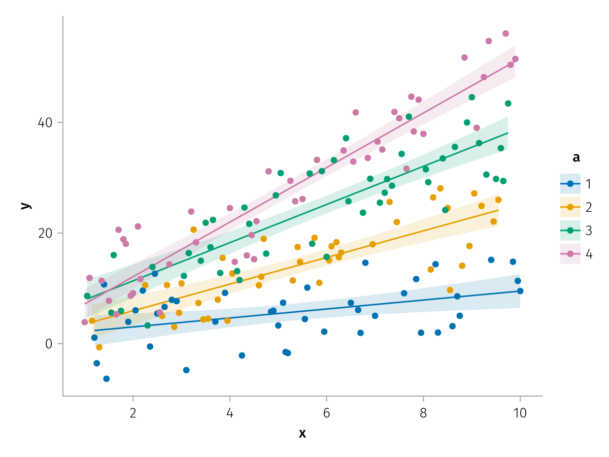 specs = data(df) * mapping(:x, :y, color=:a => nonnumeric) * (smooth() + visual(Scatter))