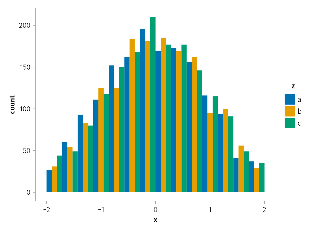 specs = data(df) * mapping(:x, dodge=:z, color=:z) * histogram(bins=range(-2, 2, length=15))