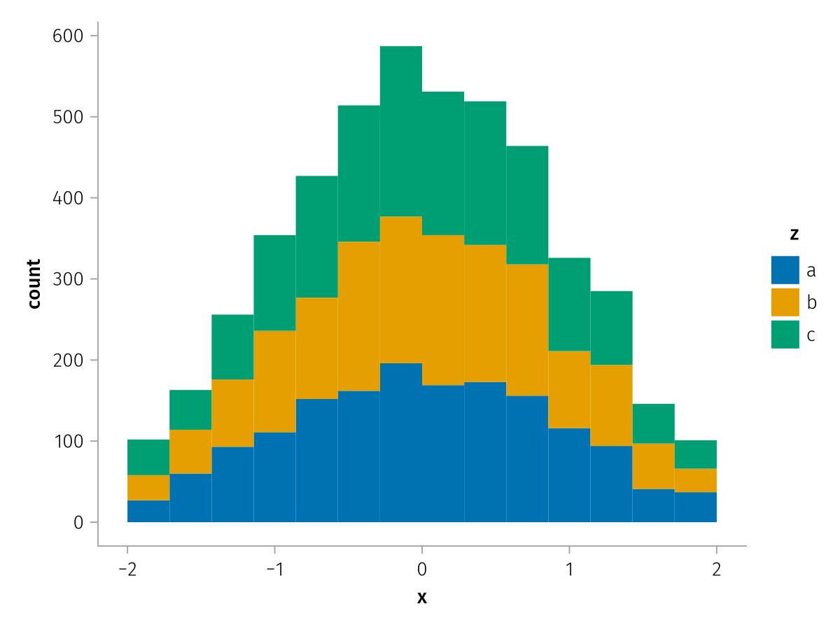 specs = data(df) * mapping(:x, stack=:z, color=:z) * histogram(bins=range(-2, 2, length=15))