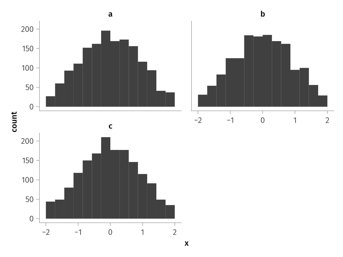 specs = data(df) * mapping(:x, layout=:z) * histogram(bins=range(-2, 2, length=15))
