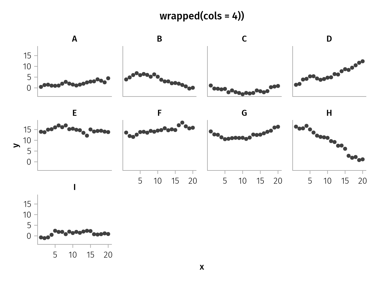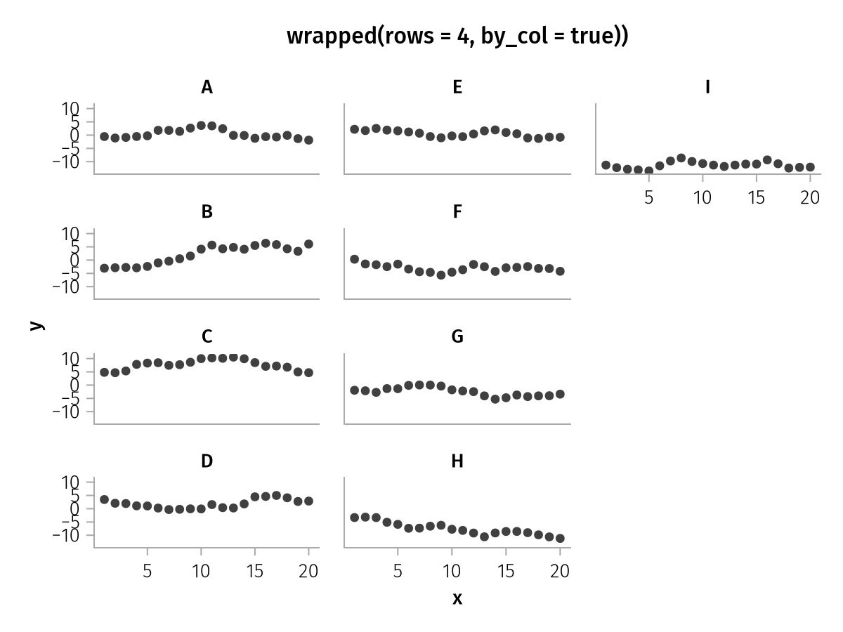 Normally, with the Layout aesthetic, rows wrap automatically such that an approximately square distribution of facets is attained. The wrapped function is a convenient helper to control the shape of the layout. You can control the maximum rows or columns, and the direction in which the layout is filled, which is row-by-row by default.