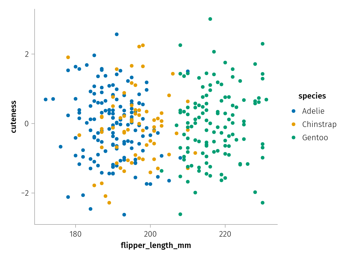 Let's pretend we have computed a "cuteness score" for our penguins using some classifier, which we now have in a vector. We can create a plot where we mix that data with the penguins dataframe without having to construct a new table: